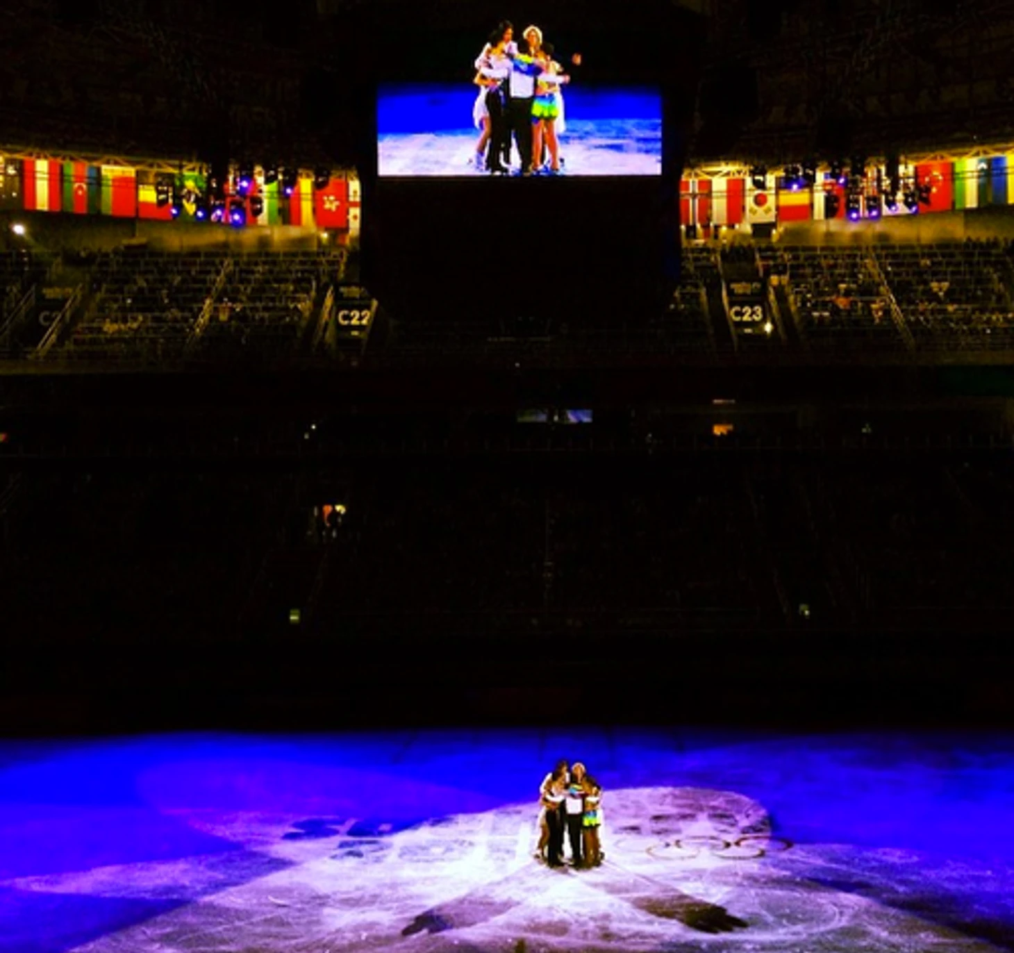 23.05 Сегодняшняя программа завершена. Красивое завершение вечера – объятия олимпийских чемпионов по фигурному катанию в центре «Айсберга».
