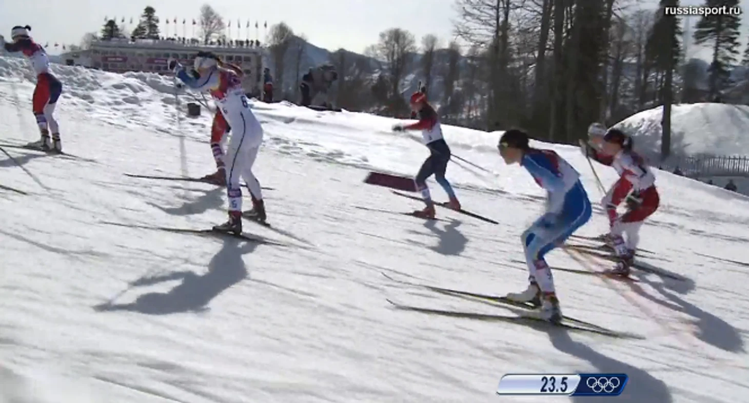 13.47 На отметке 8 км лидируют по-прежнему скандинавки, но Юлия Иванова не отстает, она девятая. А вот Хазова уже бежит не среди лидеров, 10 секунд отставания. У Чекалевой – 14, у Жуковой – 16 (хотя недавно у обеих было 20). Вся борьба в лыжном масс-старте еще все равно впереди.