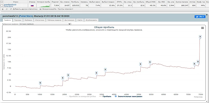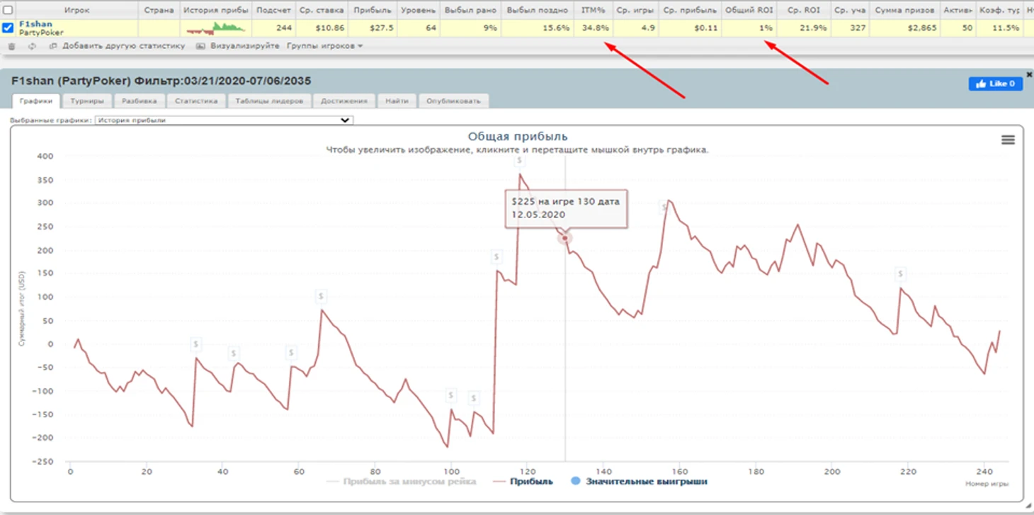 Если ITM очень большой, то это говорит о том, что мы играем не слишком агрессивно, а значит, у нас не будет профитов турнира. Казалось бы, высокий ITM, частое попадание в призы, но далеких проходов нет. Почему так? Все просто: попадая сразу в призы, мы вылетаем из турнира. Высокий ITM - это еще не показатель хорошей игры!