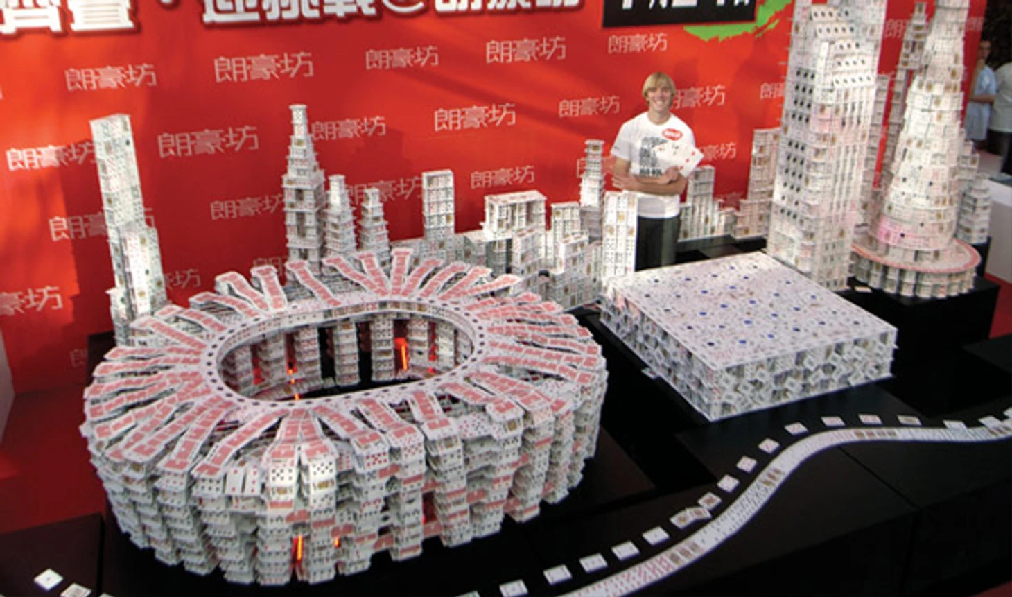 В 2008 году Берг, который использует 4-карточную структуру «сетки» в качестве основы для своих построек, за 20 дней воссоздал Пекинскую Олимпийскую деревню, потратив на это 140 000 карт.