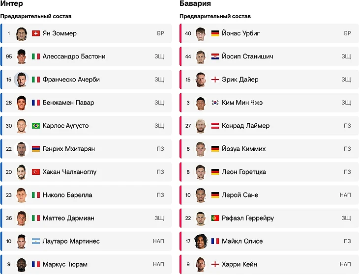 Бавария спокойно идет в чемпионате – сейчас это главный претендент на чемпионство, и вряд ли до конца сезона кто-то составит серьезную конкуренцию мюнхенцам. Даже с составом, который ослаблен травмами, Бавария представляет максимально грозную силу. По-прежнему недоступен Джамал Мусиала, с Интером не сыграет и Мануэль Нойер.