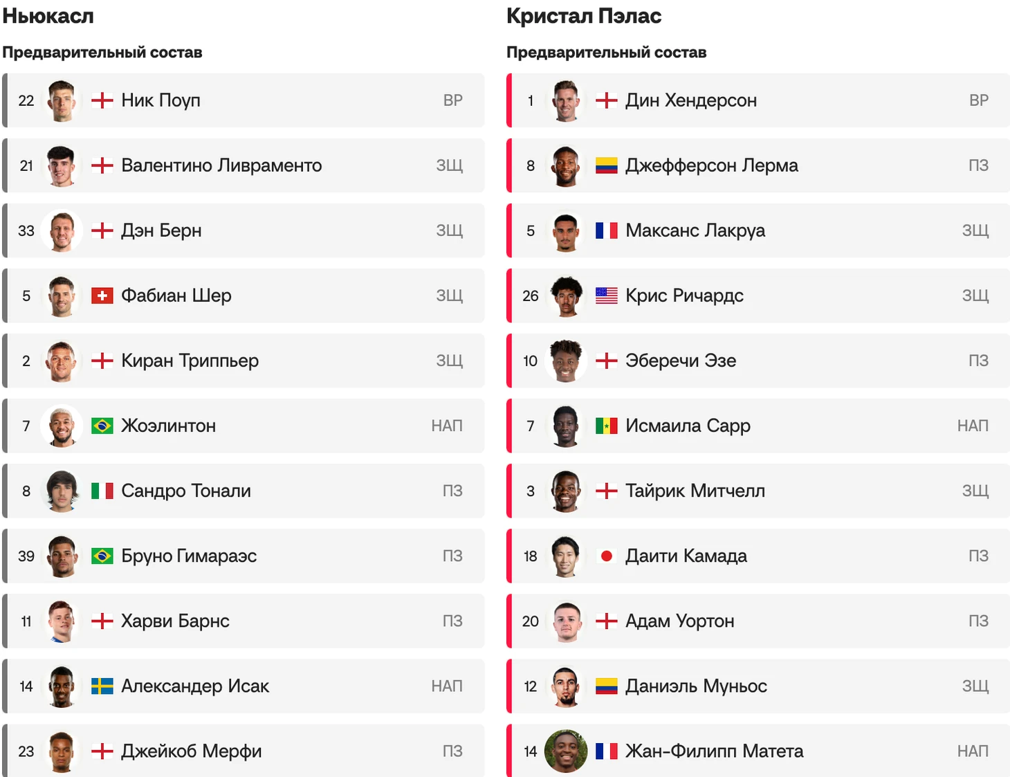 Вероятные составы команд на матч Ньюкасл – Кристал Пэлас.