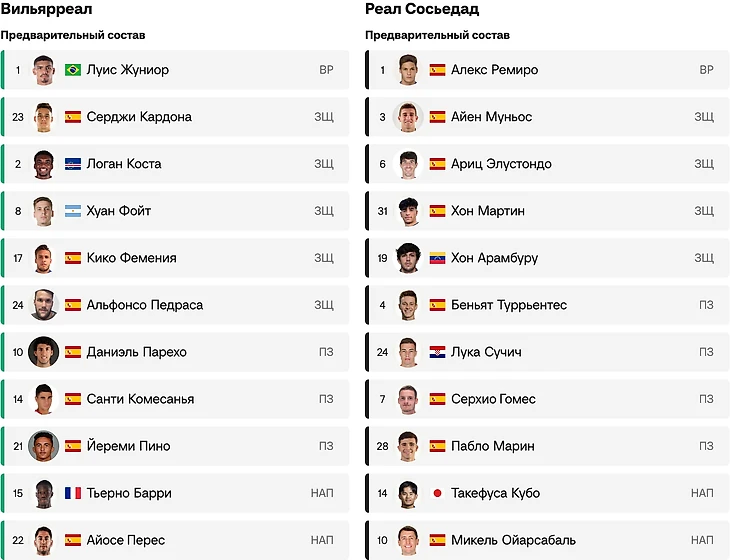 Вероятные составы команд на матч Вильярреал – Реал Сосьедад.