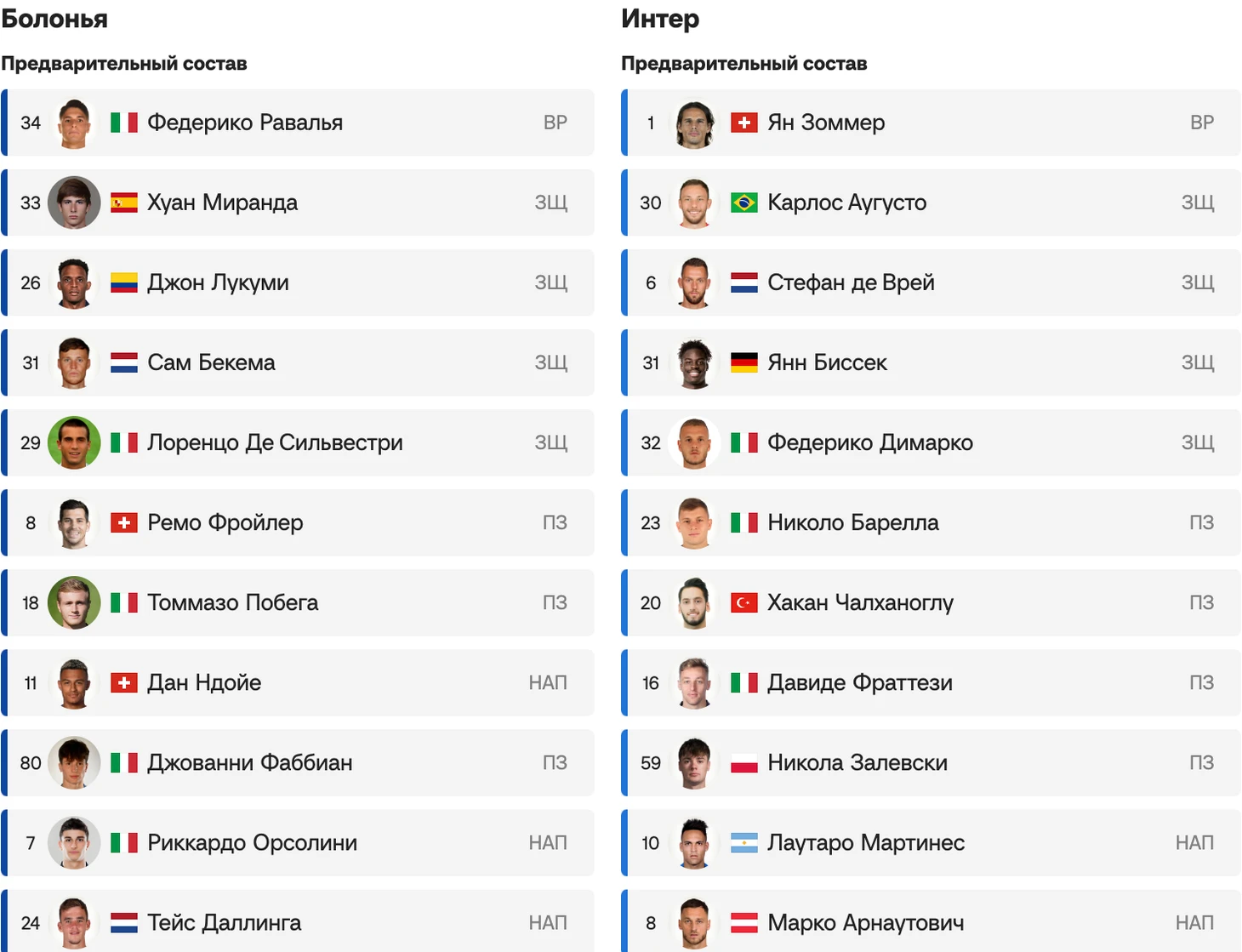Запасные: Жозеп Мартинес, Беренбрух, Кокки, Арнаутович, Аслани, Залевски, Тареми, Ди Дженнаро, Биссек, Димарко, Фраттези, де Врей