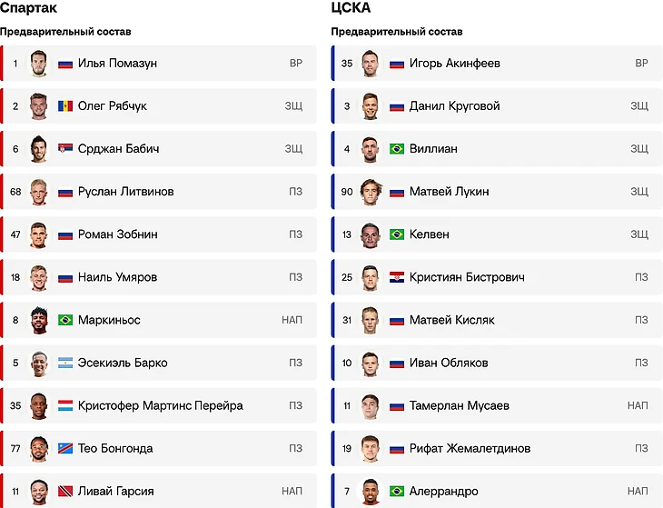 Вероятные составы на матч Спартак – ЦСКА по версии Спортс´´.