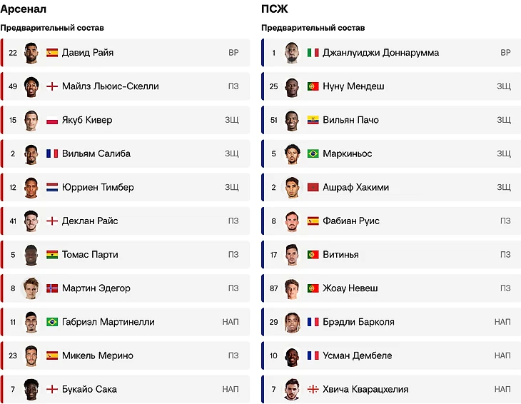 Доннарумма, Мендеш, Пачо, Маркиньос, Хакими, Фабиан Руис, Витинья, Жоау Невеш, Кварацхелия, Дембеле, Д. Дуэ