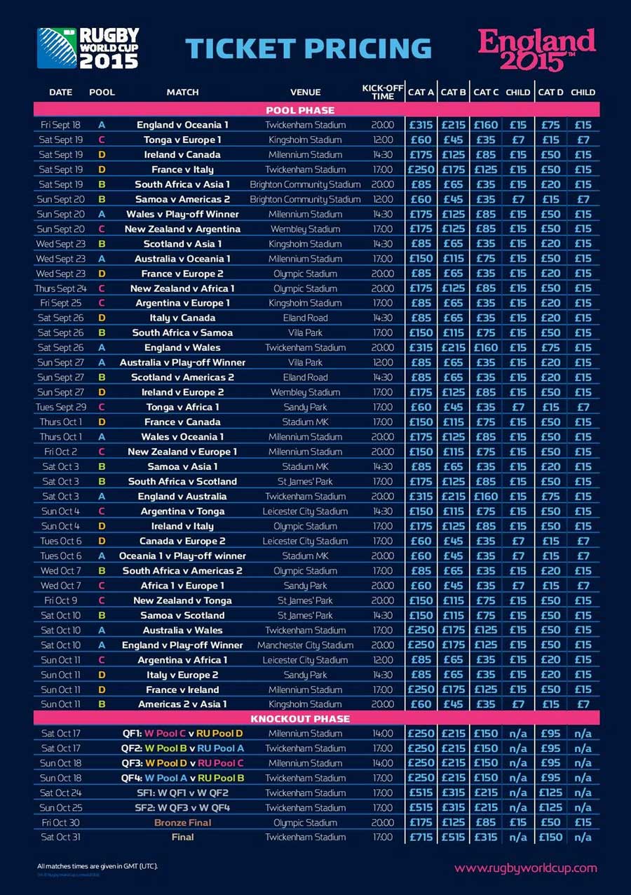 Организаторы Кубка мира-2015 по регби в Англии объявили стоимость билетов на матчи соревнований.