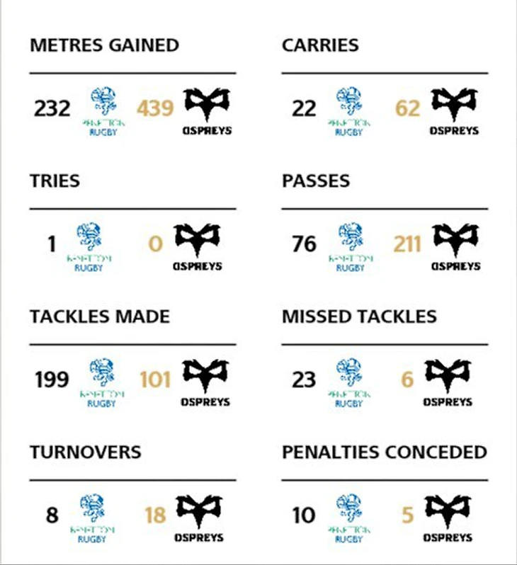 Пара слов об упомянутых выше Лейнстер и Оспрейс (прошлогодние полуфиналисты). Оспрейс начали турнир без нескольких своих ключевых игроков типа Аллун Вин Джонса, Риса Уэба и Дэна Биггара. К игре с Бенетоном в четвертом туре ожидалось их возвращение в состав. Сильно помочь они не смогли - Биггар, например, сломался на 15 минуте. Мозгов и комбинаций в той игре было не очень много, а желания пробиться напором через итальянскую защиту хоть отбавляй. Протолкнуться не получилось, а невнимательность в самом начале игры привела к итальянской попытке, отыграть которую не вышло. Бенетон тоже не особо порадовал комбинациями, но желания биться, нежелания отступать было достаточно. На это было интересно смотреть. В конце матча дали статистику, по которой регбисты из Тревизо сделали на 100 захватов больше соперника. Цифра меня впечатлила.