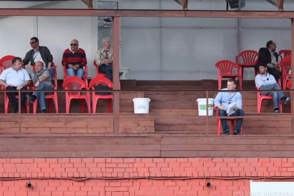 в голубой рубашке в первом ряду смотрит на игроков «Славы» и «Новокузнецка» в деле