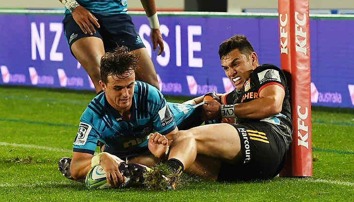И все же колоссальное давление и преимущество Блюз в территории вскоре принесло свои плоды - Синие выстрелили дуплетом (хотя не понимаю, что ТМО сумел разглядеть на повторах попытки Нанаи). На исходе часа Гленн Ньюмэн (видеорефери встречи) удивил еще больше: просматривая с разных углов приземление мяча Офа Ту'унафаси он ответил: «I'm Okay with that», видимо, считая, что контролировать мяч можно кончиками пальцев одной руки и корпусом соперника, в который снаряд явственно отскочил, когда столб Синих начал его терять (а это, по правилам, должна была быть игра вперед). Надежды Чифс отыграться подкреплялись только промахами Харри Пламмера при реализациях (в итоге флай-хав Блюз не забил ни одной), но в похожей с Ту'унафаси ситуацией Гленн Джексон зафиксировал-таки потерю Пита Совакула и попытку не принял. Еще через пять минут арбитры вновь заставили удивляться, когда выносили решение по приземлению мяча Сэмом Кейном: на повторе видно, что фланкер Чифс, будучи в захвате, вместо освобождения от мяча совершает движение в сторону зачетки, что, по идее, должно наказываться штрафом, о чем свидетельствует и реплика ТМО, но на ответ Джексона: «так что, игра вперед?» - Ньюмэн отвечает: «да». Впрочем, это на результат влияния не оказало - Блюз успели в последние минуты занести еще и бонусную попытку, вновь погрузив Вождей на дно турнирной таблицы.