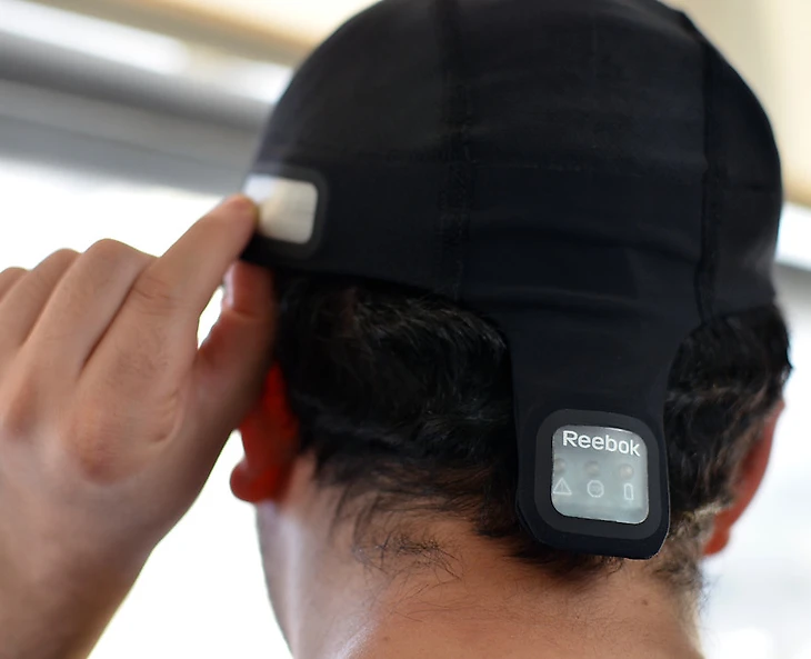 Шесть лет назад свою шапку со встроенными датчиками (трехосевой акселерометр + гироскоп) презентовали в Рибок. Устройство Reebok Checklight даже получило награду на каком-то конкурсе потребительской электроники в фитнесе и спорте, но в продаже в настоящее время нигде не ищется. Умельцы из Adafruit когда-то разобрали его и посмотрели на внутренности. Любители электроники могут увидеть это тут. Эта шапка не строит графики, но имеет три светодиода на затылке и показывает степень опасности столкновения красной лампочкой. Лимит срабатывания жестко вшит производителем. Ребята из Рибок предлагали надевать её под боксерский, хоккейный и футбольный шлем.
