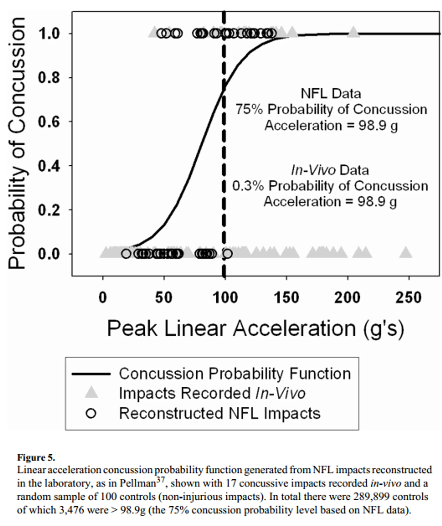 Данные, полученные системой HITS после воспроизведения в лабораторных условиях столкновений из игр по американскому футболу, показывают, что, при пиковом ускорении около 100g, полученным после удара, вероятность получить сотрясение будет около 80% (источник).