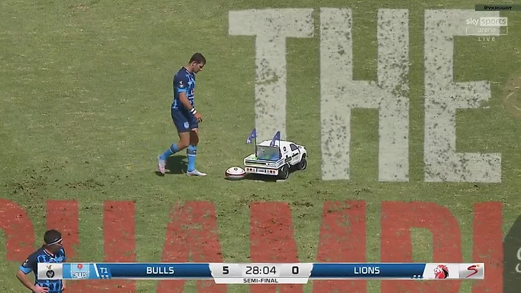 Матч был не без юмора, о чем я расскажу. Но не сразу, а постепенно в ходе описания матча. Первый тайм длился около часа, так как игроки долго не разыгрывали мяч, судье это не всегда нравилось, и он останавливал матч. Но иногда остановки были нужными, ввиду того, что надо было подлатать игроков, то повязку на лоб намотать, то ногу побрызгать заморозкой, думаю игрокам очень хотелось холодненького в такую погоду под ярким и горячим солнцем. Это у нас зима, а в ЮАР ведь лето, самая середина лета. Как у нас середина июля. Итак, за первые 10 минут матча игроки двух команд редко добегали до 22-х метровой отметки соперника, а если добегали с мячом, то атакующие команды там и нарушали правила. А вот на 10 минуте матча, Морне Штейну(10 номер) из Буллс надоело это и он заметив мало защищающихся игроков на левом фланге и решил отдать пас не назад, а вперёд, ногой. Мяч проскакал метров 10 и когда игрок Лайонс собирался его схватить и прервать атаку, этот самый мяч схватил Стравино Якоб(11 номер) и сделав поворот вокруг своей оси плюхнулся с мячом в зачетке Лайонс. Есть 5-0 в пользу Буллс. Морне Штейн пробивая реализацию не попал в ворота. Но зато потом точно дважды пробил со штрафных, доведя счёт до 11-0 к концу тайма. Игроки Лайонс очень много фолили, но всё-таки далековато от ворот. Но дважды сделали в удобных для Штейна позициях. И очень забавно было наблюдать, как привозят подставку игроку для пробития штрафного. На машинке с радиоуправлением, а может и вовсе там сидят миничеловечки и рассекают по стадиону.
