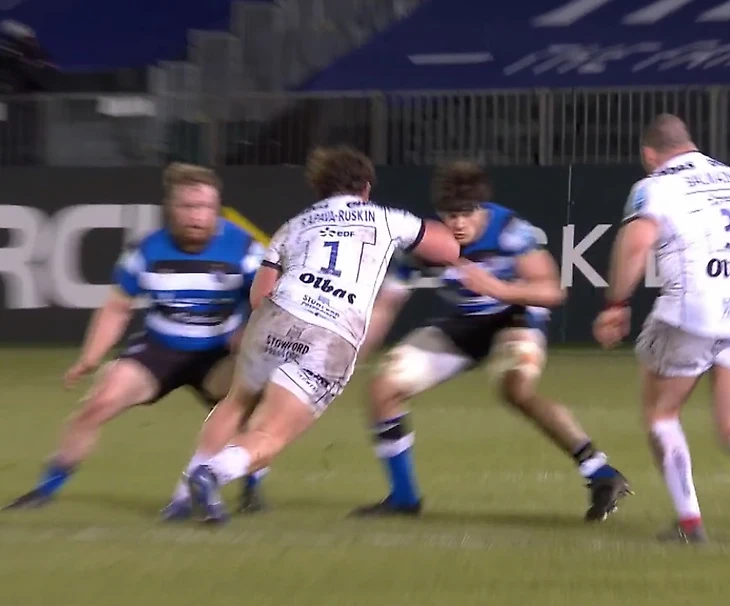 Арбитр матча Уэйн Барнс особо не сомневался в решении, но попросил убедиться арбитра ТМО (видеопросмотр) Тома Фоли. Пообщавшись и убедившись, что другого решения не принять в этом эпизоде, Раскину была предъявлена красная карточка. Команда осталась на 72 минуты в меньшинстве. Джордж Скривингтон (главный тренер Глостера) в эфире БТ Спорт сразу по горячим следам сказал, что для игровой модели потерять столба не столь критично. Но тем не менее с игры снял Тома Сибрука (12 номер) и выпустил Алекса Сивилла (17 номер). Как ни крути, а схватка без столба невозможна. Игра продолжилась, и что же мы увидели. А увидели мы то, что преимуществом завладели регбисты Глостера. Играя в меньшинстве они допускали потери только в 22-метровой зоне хозяев, куда их пускали без особых проблем. А вот там уже не давали дойти до зачетки, или регбисты Глостера сами теряли мяч. А вот регбисты Бата теряли мяч на всех участках поля весь первый тайм. И такими подарками гости к сожалению не воспользовались. Играя в меньшинстве, Глостер всё-таки вёл к концу первого тайма 6-0. Это Билли Твелвтриз (10 номер) без особо труда забил два штрафных метров с 10. Видя, что последний рубеж не преодолеть, решил набирать очки со штрафных. В чем и преуспел. Тайм тихонько катился как победе гостей. Да ещё Семеса Рокодугуни (14 номер) в попытке остановить проход Луиса Рис-Заммита (14 номер) сломал руку и был заменён на Джонатана Джозефа (23 номер). И Алекс Крейг (5 номер), Джорди Рид (6 номер) и Льюис Ладлоу (7 номер) сцепившись в единое целое попытались силой влететь в зачётку хозяев, но были остановлены в сантиметрах от зачетки и Уэйн Барнс остановил игру, чтобы разобраться в увиденном. Попытку он не защищал, так как её не было. А затем продолжил игру. А регбисты Глостера чуть раньше решили расслабиться и были мыслями в раздевалке, потирая руки от успешной игры. И были за это наказаны Таулупе Фалетау (6 номер), которого партнеры вывели на свободное пространство и он занёс попытку. А Рис Пристланд (10 номер) забил реализацию. Вот такой интересный первый тайм.