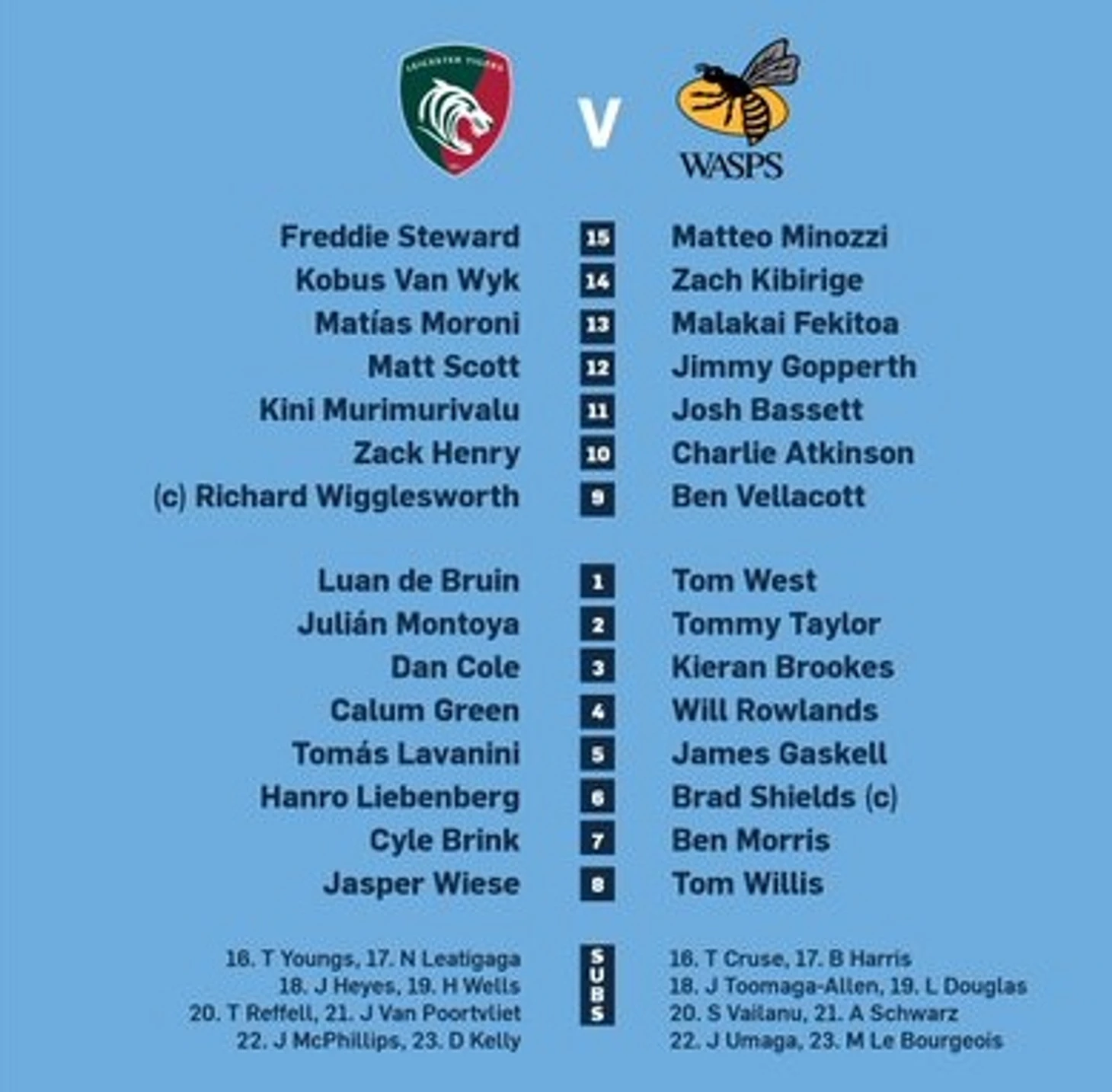 Не успел начаться второй тайм, как численность составов уравнялась. Киран Брукс (3 номер) всандалил с плеча и доработав локтем в голову Томаса Лаванини. Арбитры посовещались и решили, что это была чрезмерная грубость и сделали игру 14 на 14. Поиграв 5 минут в разного рода бодания, Лестер опять применил свою излюбленную схему набора очков. Да-да. Штрафной, Хенри, аут, коридор. Ну вы поняли, Монтойя занёс попытку. А спустя почти 15 минут и Уоспс показали, что умеют использовать коридоры для заноса попыток. Том Круз (16 номер) принёс для своей команды 5 очков, положив мяч на линию зачётки. Этого и хватило для попытки. А вот Джэйкоб Умага (22 номер) добавить ещё 2 очка для команды не смог. В середине последней десятиминутки Томми Риффел (20 номер), заменивший лучшему игрока матча Кайла Бринка (7 номер) принёс ещё 5 очков для своей команды. И ни за что не догадаетесь как была эта попытка занесена. Хотя наверное уже догадались. Коридор, ну и схему вы поняли. Только Монтойю заменил Янгс (16 номер). И все. А окончательный счёт мог установить Джонни МакФиллипс (22 номер), который и заменил Хенри прямо перед пробитием реализации. Видимо он недостаточно размялся и смазал реализацию. Все три реализации у Лестера матче были пробиты мимо ворот. А также и реализация Уоспс была мимо. 4 реализации из 4. Прям Страйк по промахам. И на этом матч не закончился. Ещё было достаточно интересного в матче. И первым идёт ещё одна красная карточка для Лестера. Анро Либенберг (6 номер) этот счастливчик. Либенберг подсел под Джоша Бассетта (11 номер) в борьбе за мяч после розыгрыша мяча с центра поля и получил коленом от Бассетта в голову и отправился в легкий нокдаун. Выйдя из нокдауна он отправился досматривать матч на трибуны. А уже в добавочное время состоялся дебют Алекса Шворца (21 номер), который заменил Бэна Велокотта (9 номер) на позиции скрам-хава. И даже принял участие в одном моменте, когда пытался бороться за мяч после того, как Том Круз, только не тот Круз, что актёр из Миссии невыполнима, но тоже с невыполнимой миссией добыть ещё 5 очков для своей команды, перехватил мяч после розыгрыша коридора от Лестера. Поймав мяч после заброса Тома Янгса он пробежал пару метров и пнул мяч себе на ход. Но хукеры не выдающиеся бегуны, поэтому и атака быстро захлебнулась, а матч был остановлен. 27-8 победа хозяев. Каллум Грин (4 номер) отметил успешно свой 50-й матч за Лестер. А вот Джош Бассетт не может похвастаться успехом в сотом матче за Уоспс в Премьершипе. Также как и Уилл Роуландс (4 номер), который проводил свой сотый матч во всех турнирах за Уоспс. И вот теперь все.