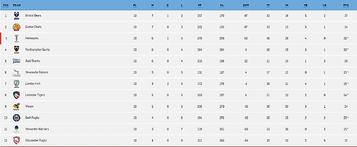 *Отмененный матч. Вустер Уорриорз 4 очка, Ньюкасл Фалконс 2 очка(10 тур).