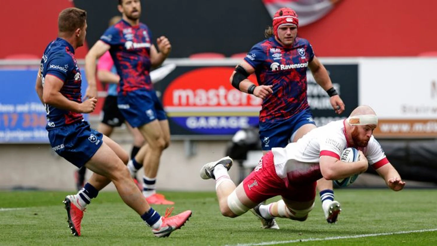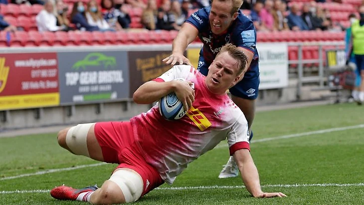 Матч начался по-разному для обеих команд. Для Бристоля очень удачно, а вот для Арлекинс нет. Складывалось ощущение, что регбисты Арлекинс забыли выйти на матч. После первых пяти минут игры счёт был 6-0 в пользу хозяев, а точнее в пользу Мишек, да позволят мне так называть команду из Бристоля. Каллум Шиди (10 номер) дважды наказал гостей за нарушения правил достаточно близко от ворот. А дальше регбисты Бристоля шли по плану в 80 очков за игру. К 28-й минуте было занесено 4 попытки, три из них по левому флангу атаки Бристоля, или по правому флангу обороны Арлекинс. Бэн Ирл (7 номер), Макс Малинс (11 номер), потом ещё раз Макс Малинс. А вот Люк Морахан (14 номер) занёс попытку справа. Каллум Шиди смог забить только одну реализацию, причём только после попытки Морахана. И вот тогда стало заметно, что регбисты Арлекинс вышли на поле. Стартовый натиск на сумасшедших скоростях закончился и регбисты Бристоля начали уставать. И Арлекинс смогли наконец пересечь середину поля и повладеть мячом. А именно владение мяча, хоть какое-то нужно для стремительных атак. Луис Лайнах (14 номер) занёс первую попытку для Арлекинс, но её отменили. Отменили потому что за долю секунду до приземления мяча в зачетную зону Мишек его ноги вынесли за пределы поля. А за две минуты до конца тайма Алекс Домбрандт (8 номер) сумел продраться сквозь оборону хозяев и добрался-таки до зачетки без происшествий и принёс первые 5 очков для команды. Маркус Смит (10 номер) последовал примеру Шиди и тоже промазал реализацию. Итак, 28-5 по итогам первого тайма.