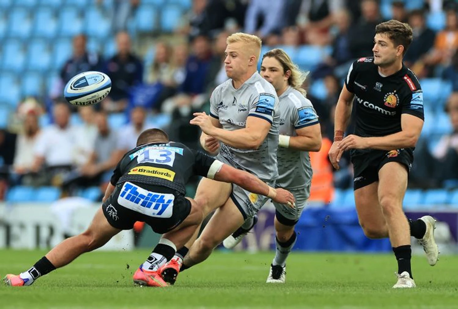 Подопечные Роба Бакстера решили не повторять ошибки прошлых матчей и вышли на этот матч полностью мобилизованными. И это не мудрено, ведь это один из двух важнейших матчей для Эксетер Чифс в сезоне, во всех остальных они чаще валяли дурака, если так можно выразиться. В регби, конечно, валять дурака нельзя, если брать значение данной фразы, как относиться несерьёзно. Но давайте перейду к игре. Регбисты Эксетер Чифс реально вышли побеждать. Это читалось в каждом их действии, даже когда они совершали ошибки. А вот регбисты Сэйл Шаркс вышли на матч, как будто у них есть право на ошибку, которую они постоянно и пытались совершить. На четвёртой минуте Ману Туилаги (12 номер) буквально выключил свет Ричарду Капстику (7 номер). Ему очень повезло, что арбитр Том Фоли ограничился горчичником для него, а не показал ему карточку красного цвета. Капстика пришлось заменить после того удала в голову на Дона Арманда (20 номер). И Эксетер Чифс показали, почему они являются лучшей командой Премьершипа по реализации лишнего игрока. Две попытки и одна реализация. 12-0 за 11 минут. Люк Коуэн-Дики (2 номер) и Том О’Флаэрти (11 номер) принесли по пять очков, а Джо Симмондс (10 номер) 2 очка. Туилаги вместо десяти минут отдыха отдыхал 12 минут. Спросите почему? Да потому что не было повода выпустить его на газон, не было остановок игры. И ближайшая остановка случилась в момент, когда Чифс нарушили правила и Сэйл Шаркс получили право на пробитие штрафного удара, который Роб дю При (10 номер) забил и сократил отставание в счете. Затем каждая из команд заработала по очередному штрафному. Дю При свой штрафной запулил мимо ворот, а вот Джо Симмондс решился на прямой удар по воротам. А я немного углублюсь в статистику, и напишу, что Эксетер Чифс по воротам особо не били штрафные, а предпочитали выбить мяч в аут поближе к зачетке соперника, чтобы набрать побольше очков. Штрафной это 3 очка, попытка 5 очков, реализация 2 очка. То есть 7 очков поинтереснее 3 очков. Но вот матч важный и бить по воротам лучше, чем не заносить попытки. В общем Джо Симмондс решился пробить по воротам и вернуть разницу в счете в 12 очков. И у него получилось. Благодаря этому точному удару он вышел на второе место по набранным очкам в матчах на выбывание. Догнать лидера, которым является Оуэн Фаррелл в этом сезоне не получится, но приблизится получилось. А после этого Рохан Янсе ван Ренсбург (13 номер) подкараулил мяч после того, как защита Эксетера не смогла принять это самый мяч после удара Роба дю При с центра поля. Ван Ренсбург быстро сориентировался и положил попытку в зачетку хозяев. Не прошло после этого и пяти минут, как Джэк Ноуэлл (15 номер) решил сам разыграть штрафной в пяти метрах от зачётки соперника. Обычно так разыгрывают игроки схватки, а тут фуллбэк. И ладно бы перед ним никого не было, так нет же, перед ним были игроки схватки Сэйла. Но Ноуэлл продавил всех и принёс 5 очков. Симмондс забил реализацию, а Шаркс до конца тайма смогли ответить только успешно забитым штрафным от дю При, который играет под 10 номером. Напомню, что у Сэйла в этом матче играло ещё два дю При. Жан-Люк (5 номер) и Дэниэль (8 номер).
