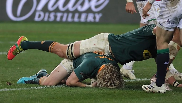 Уже вскоре помощь Йонкера понадобилась вновь: Бокс подобрали на своей половине небрежно брошенный ими же пас, Маказоле Мапимпи ногой метнул снаряд по тому же левому флангу, дю Той преследовал его, но перелетел, подоспевшего Мбонамби Львы повалили на землю, но быстрее всех в суматохе сориентировался де Клерк и заземлил попытку. Йонкер проверял касание мяча рукой дю Той - в таком случае была бы зафиксирована игра вперед, но ничего похожего на это не углядел (хотя на некоторых повторах было похоже). Так как реализация Полларда улетела мимо, разница в счете достигла 7 очков, которые сократились тут же до 4 после штрафного за высокий захват Мостертом Алуна Вина Джонса, а на 55-й минуте и до 1 очка.