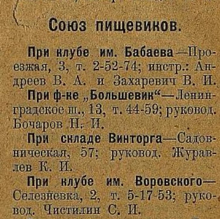 Клубы пищевиков из «Вся Москва. Справочная и адресная книга на 1926 год»