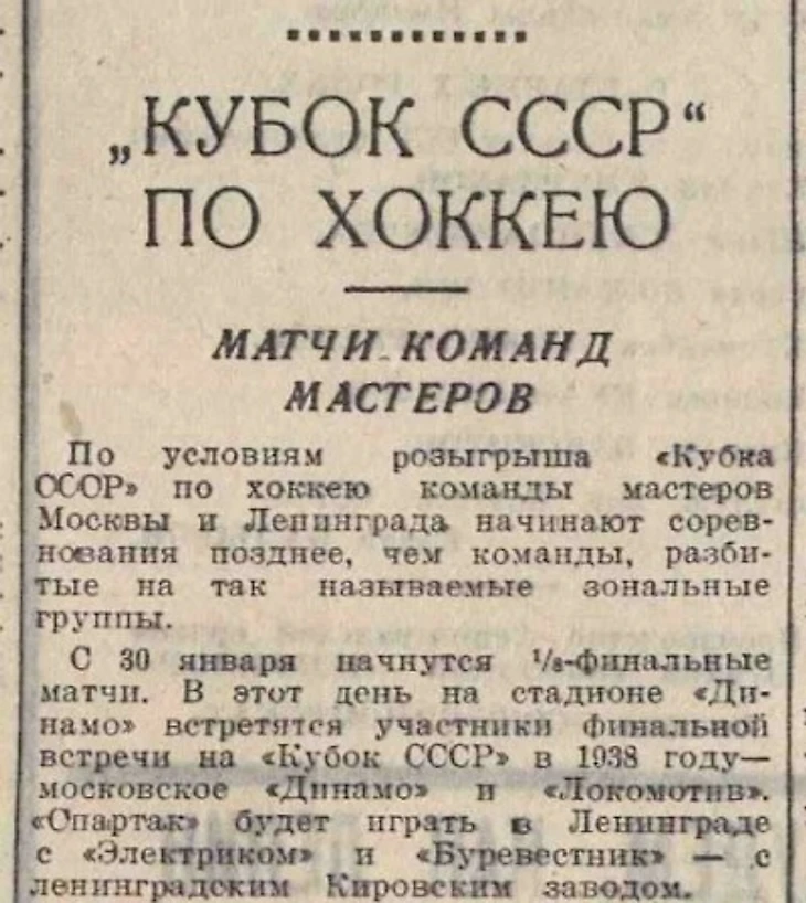 14 января 1939 года. Кубок Москвы по хоккею. Четвертьфинал (газета «Красный спорт» за 15 января 1939 года)