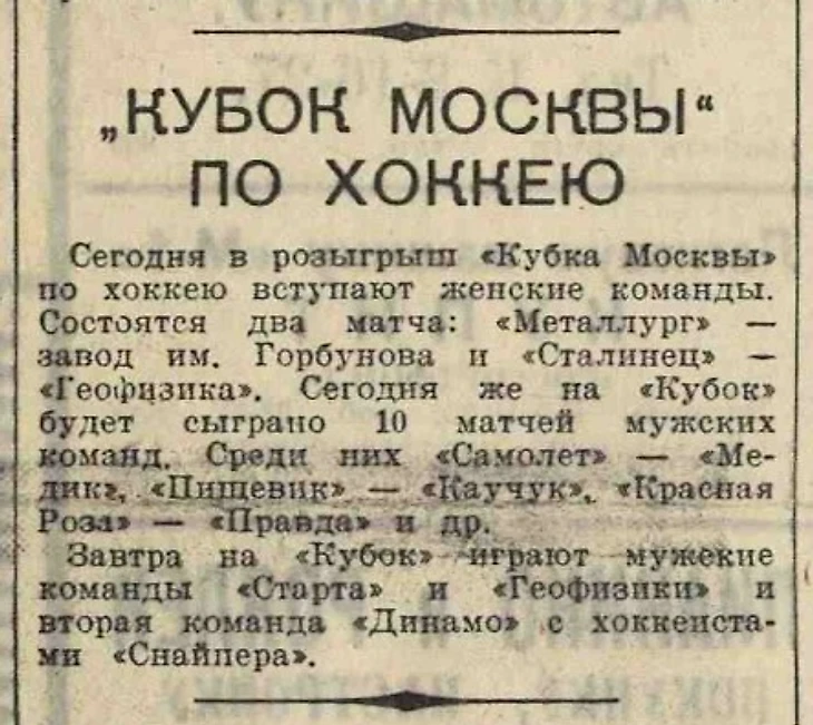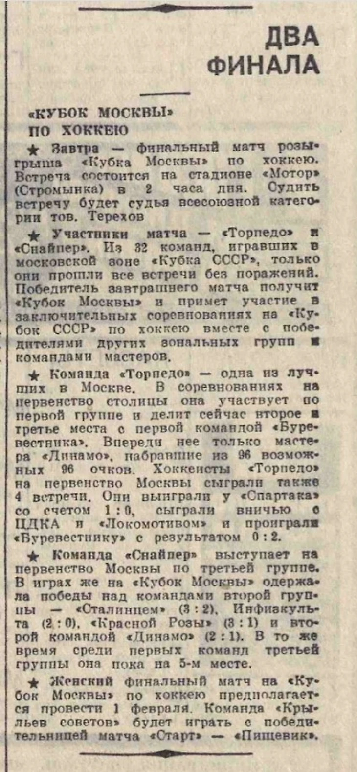 Анонс финала хоккейного Кубка Москвы между командами «Торпедо» и «Снайпер» на стадионе «Мотор» (улица Стромынка) из газеты «Вечерняя Москва» за 27 января 1939 года