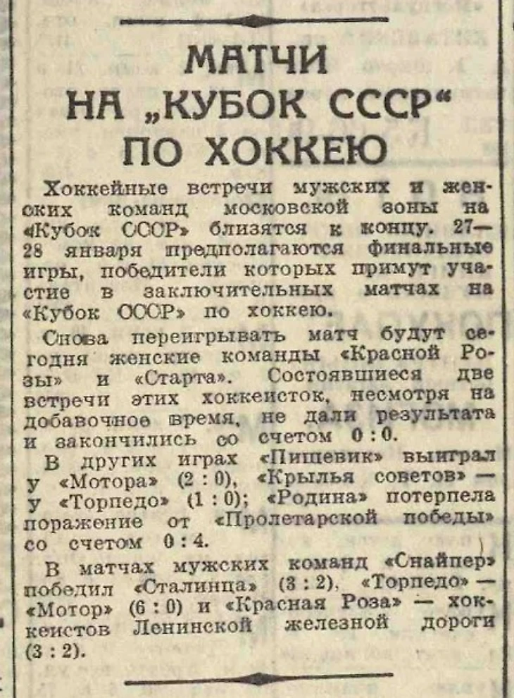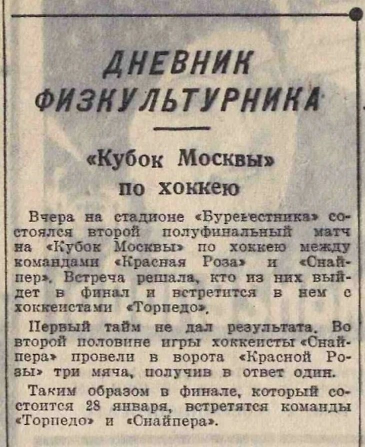 25 января 1939 года. Кубок Москвы по хоккею. Полуфинал. Повторная игра. «Снайпер» - «Красная Роза» - 3:1 (0:0) / газета «Вечерняя Москва» за 26 января 1939 года