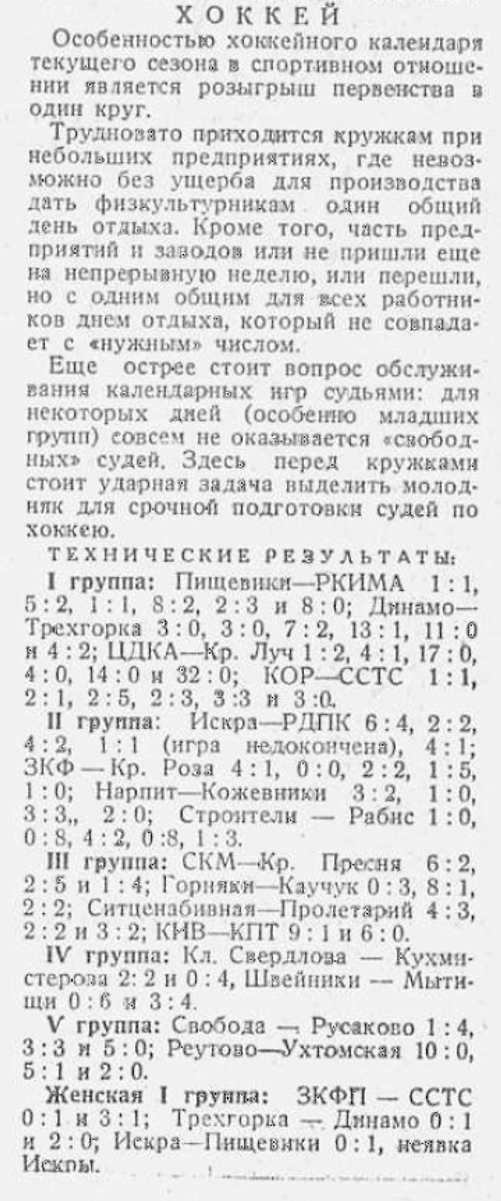 «Сезон 1930-1931 годов, прошедший под знаком оргперестройки коллективов по производственному принципу, изменил и картину хоккейной жизни Москвы. Ряд ранее сильных коллективов несколько ослаб, зато появились десятки совершенно новых команд» (журнал «Физкультура и спорт» № 4 за 1937 год). Среди них хоккейная команда Завода имени Дзержинского, игравшая на первенство Краснопресненского района.