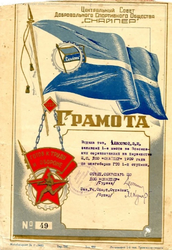 1939 год. Флаг ДСО «Снайпер» на грамоте Общества (vexillographia.ru)