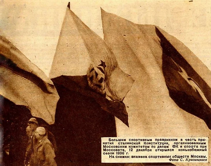 12 декабря 1936 года. Москва. Стадион «Динамо». Открытие конькобежного сезона. Знамя ДСО «Снайпер» на спортивном празднике (фото С. Красинского из журнала «Физкультура и спорт» № 24 за 1936 год)