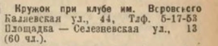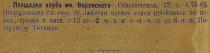Клуб пищевиков имени Воровского (в честь советского дипломата, публициста и литературного критика Вацлава Вацлавовича Воровского, убитого 10 мая 1923 года в Лозанне швейцарцем, бывшим белогвардейским офицером) на углу Селезневкой и Каляевской улиц (Каляевская, ныне Долгоруковская, дом № 44; на его месте теперь располагается жилой дом под № 40) в 1926 году был самым большим по численности (1 260 человек), опережая, луб фабрики «Дукат» (Тверская-Ямская, 46) и клуб «Красная Звезда» с Воронцовской улицы (в обоих насчитывалось по 1 200 человек). Центральный клуб пищевиков имени М.П. Томского (на тот момент он председатель Всесоюзного центрального совета профессиональных союзов / ВЦСПС) по этому показателю не входил даже в тройку (1 000), а вот по количеству занимающихся в спорткружке Центральный был среди лидеров (120 физкультурников), уступая только кружку при клубе фабрики «Красный Октябрь» (150 человек). Физкультурники же с Каляевской делили четвертое-шестые места (по 60 спортсменов) с дукатовцами и кружковцами при клубе имени 6-й Годовщины Октябрьской революции завода Госспирта (Самокатная, 4).
