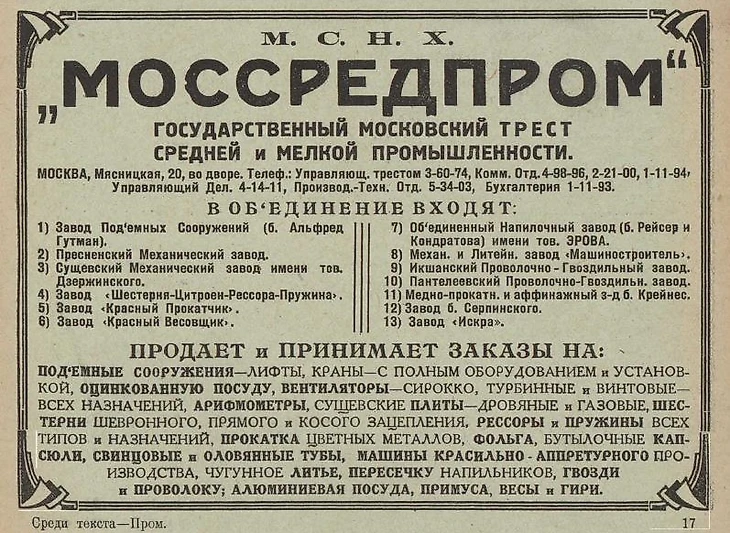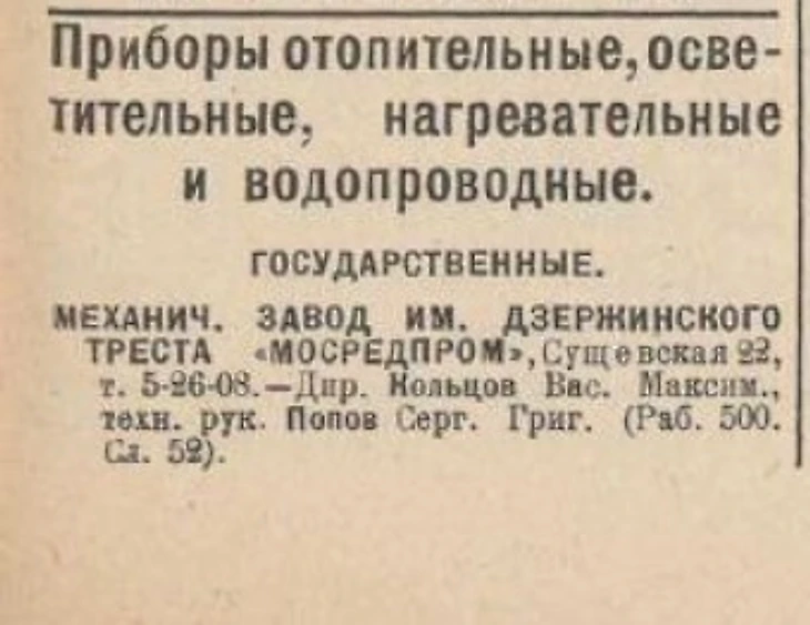 «Сущевский механический завод имени товарища Дзержинского» треста «Моссредпром» в рубрике «Приборы отопительные, осветительные, нагревательные и водопроводные» справочника «Вся Москва. 1928 год»