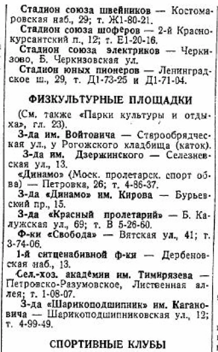 Информация о стадионах из краткой адресно-справочной книги «Москва», выпущенной в 1938 году издательством «Московский рабочий»