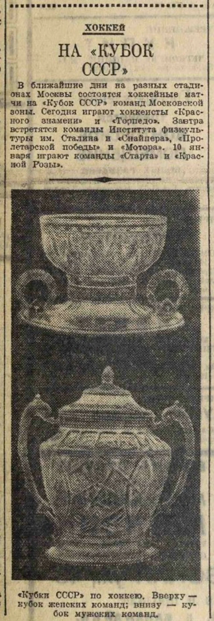 Анонс старта розыгрыша первого Кубка Москвы по хоккею в газете «Вечерняя Москва» за 3 января 1939 года