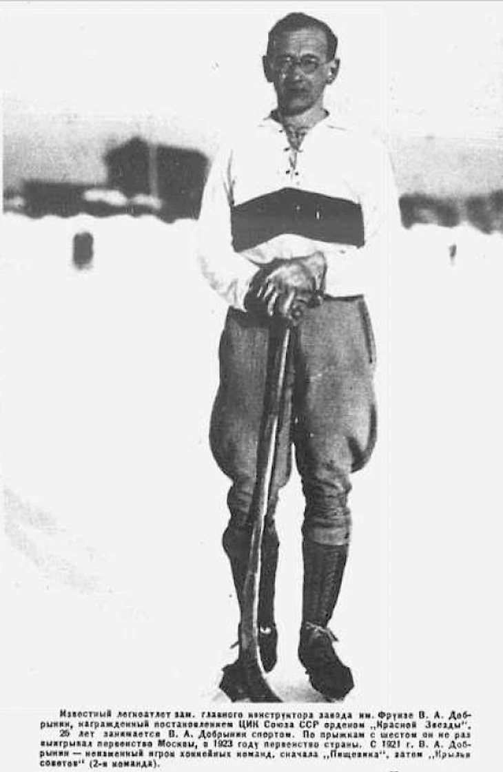Вторая половина 1920-х годов. В.А. Добрынин - игрок хоккейной команды Центрального клуба имени М.П. Томского Всесоюзного союза рабочих пищевой и вкусовой промышленности (ВСРПВП) / «Пищевики» (в 1930-е годы являясь заместителем главного конструктора завода имени Фрунзе выступал за 2-ю команду «Крыльев советов». Фото из журнала «Физкультура и спорт» № 2 за 1937 год