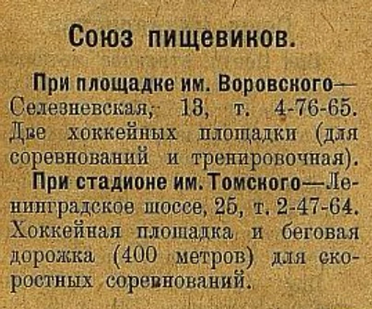 А вот хоккейное значение катка «при площадке им. Воровского» для Союза пищевиков, если ориентироваться на тот же справочник-путеводитель «Спортивная Москва» (составитель М.Б. Чесноков, 1928 год), из-за двух полей было не меньше чем у катка «при стадионе им. Томского».