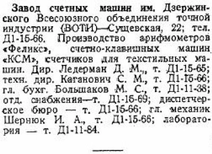 «Сущевский механический завод имени товарища Дзержинского» треста «Моссредпром» в рубрике «Пишущие машины, множительные аппараты и арифмометры» справочника «Вся Москва. 1928 год» как производитель арифмометров и кухонных плит