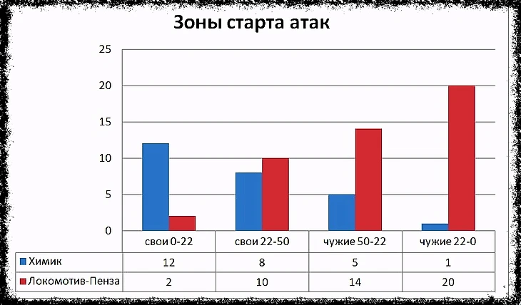 "Локомотив" часто наведывался в красную зону гостей, во многом благодаря неудачным схваткам и коридорам в исполнении "Химика", потому и диаграмма старта атак, нарисовалась в таком "обратном" для соперников варианте.
