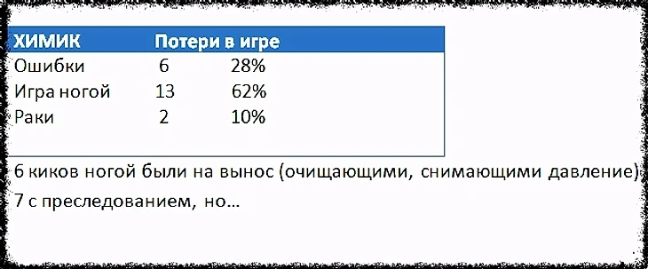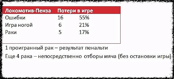 Нацеленность "Химика" на отбор мяча в брейкдауне и агрессивность в раке подтверждает и статистика нарушений в защите. 7 из 12 пенальти, полученных игроками "Химика" - в борьбе за мяч в раке.