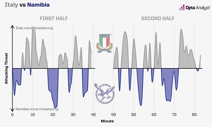 Намибия еще не выиграла ни одного матча на Кубках мира: 23 поражения в 23 играх. Италия была не в лучшей форме, но никогда не испытывала проблем. У Томмазо Аллана был отличный день, он забил все восемь ударов по воротам и внес 4,4 дополнительных очка на счет Италии, исходящих из ожидаемых очков (xP) за исполнение штрафных и реализаций.