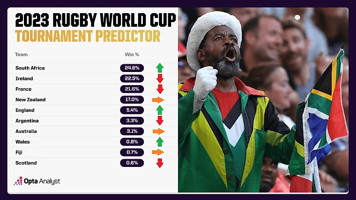 Комфортная победа ЮАР над Шотландией повысила их шансы на титул, и теперь они являются главными фаворитами по прогнозам OPTA, поднявшись с третьего места.