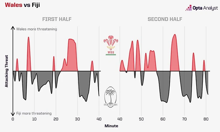 Уэльс создал четыре попытки из пяти заходов в фиджийские 22, тогда как Фиджи сделали 12 входов в валлийские 22, набрав четыре очка. Проигравшие владели мячом на 96% и владели территорией на 85% в последние 10 минут, стремясь к победе, но упущенные возможности дорого им обошлись. Теперь им придется добиваться побед над Австралией и Грузией, чтобы сохранить надежду на плей-офф.