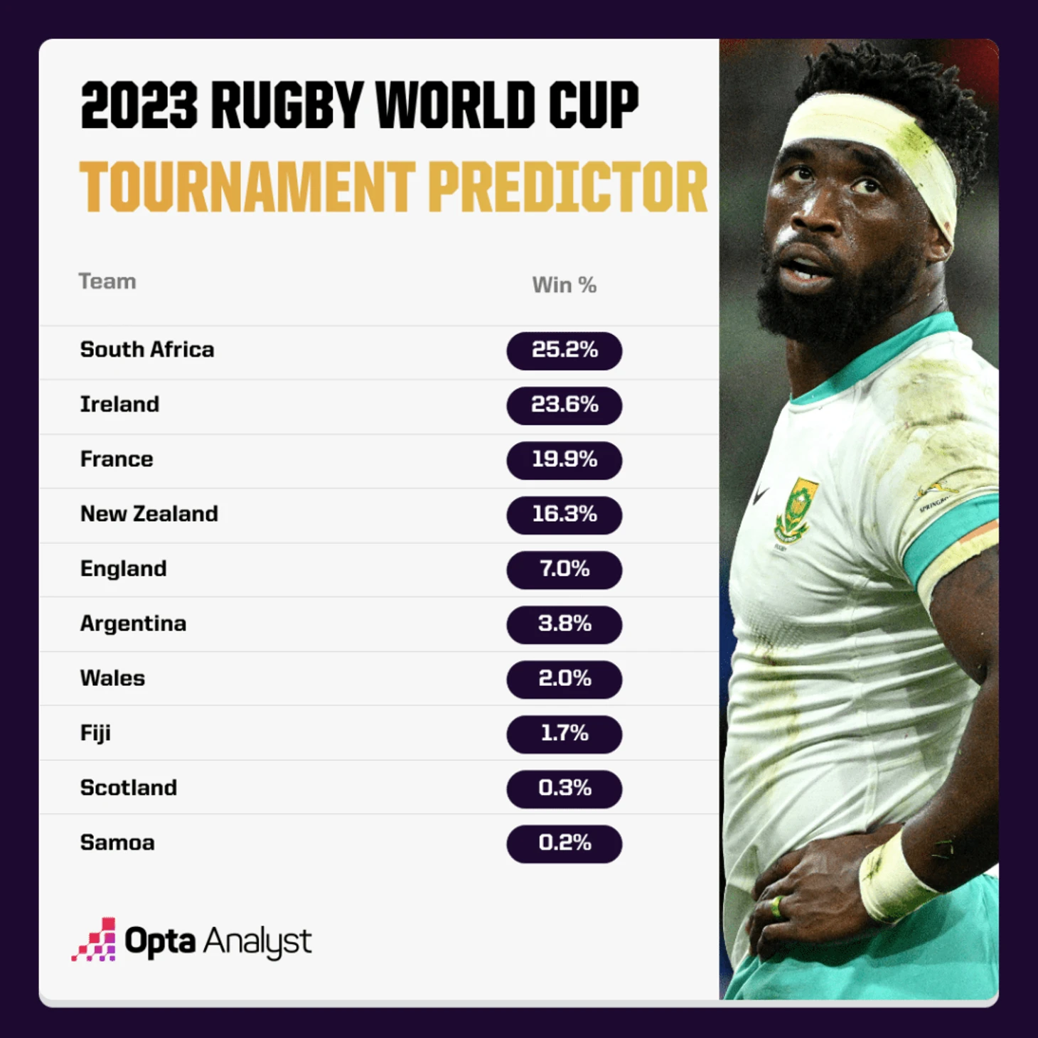 Несмотря на поражение от Ирландии, прогноз Opta по-прежнему дает Южной Африке наибольшую вероятность выиграть Кубок Уэбба Эллиса в следующем месяце, хотя Ирландия находится сразу за «Боками».