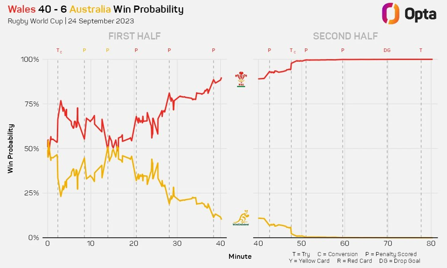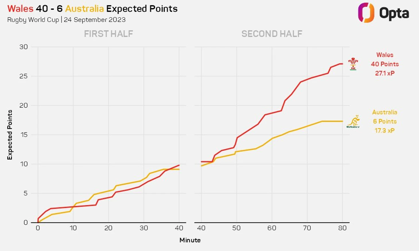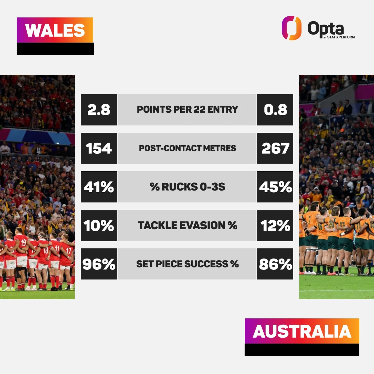 Уэльс создал больше возможностей для попыток во время игры и воспользовался ими с большей эффективностью, 11 раз войдя в «22» Валлаби и набирая в среднем 2,8 очка за заход. Это резко контрастировало с четырьмя заходами Австралии со средним баллом 0,8. Уэльс постепенно набирает обороты на Кубке мира по регби в этом году и вполне может достичь пика в нужный момент, чтобы бросить серьезный вызов в плей-офф.