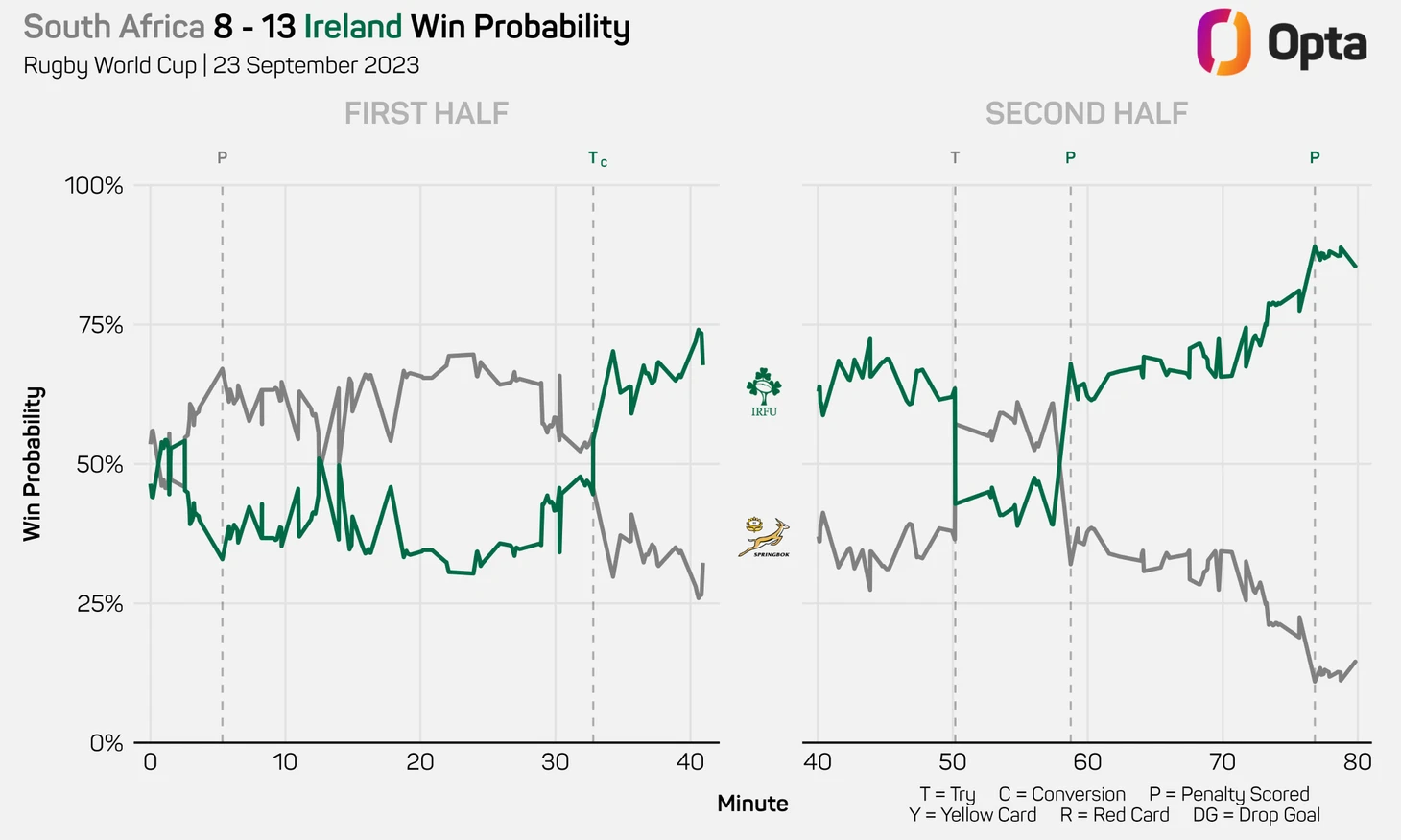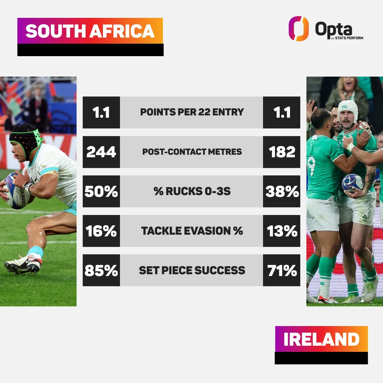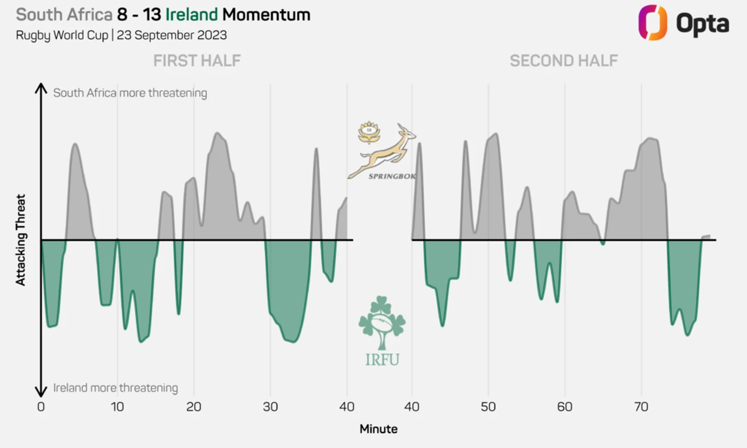 Некоторые из столкновений в игре Спрингбоков с Ирландией были настолько во всех смыслах потрясающими, что вполне могли быть зарегистрированы сейсмологами по шкале Рихтера. В общей сложности «Спрингбоки» сделали 32 доминирующих захвата в этой игре, что является максимальным показателем когда-либо зафиксированным Opta для команды уровня 1.