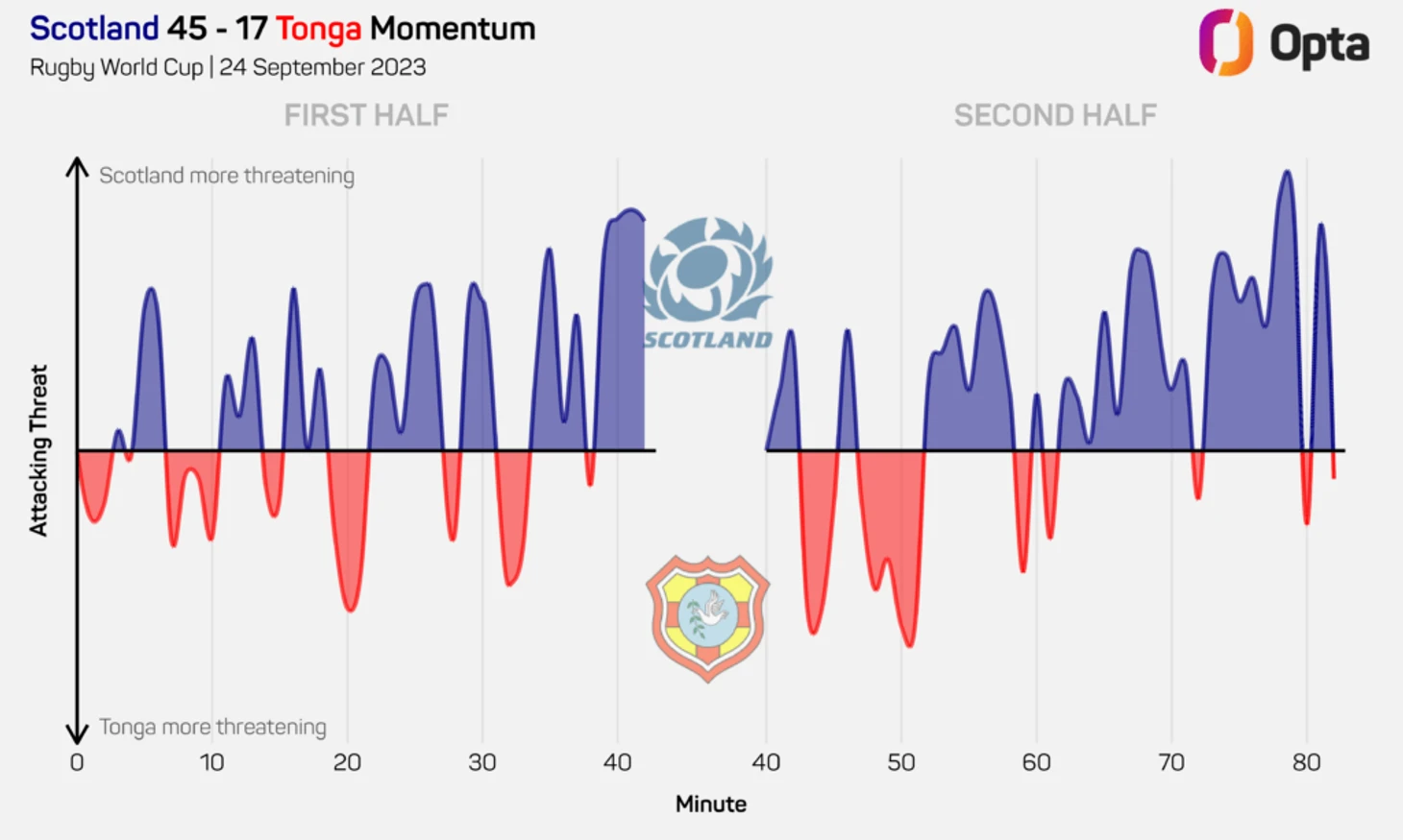 Учитывая события предыдущего вечера, Шотландия вышла на матч против Тонги, зная, что для продолжения турнира необходимо набрать пять очков. Семь попыток — и дело было сделано для подопечных Грегора Таунсенда. Шотландцы обыграли 48 защитников, что является лучшим результатом сборной Шотландии в матче Кубка мира. Духан ван дер Мерве сам «побил» 14 соперников. Только три игрока превзошли этот показатель на турнире.