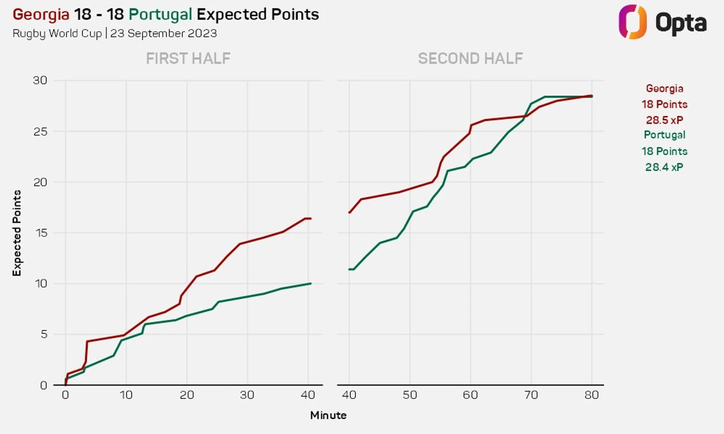 А график набора «ожидаемых очков» подчеркивает упорство команд. Как и результат xP 28,5 у Грузии против 28,4 у Португалии