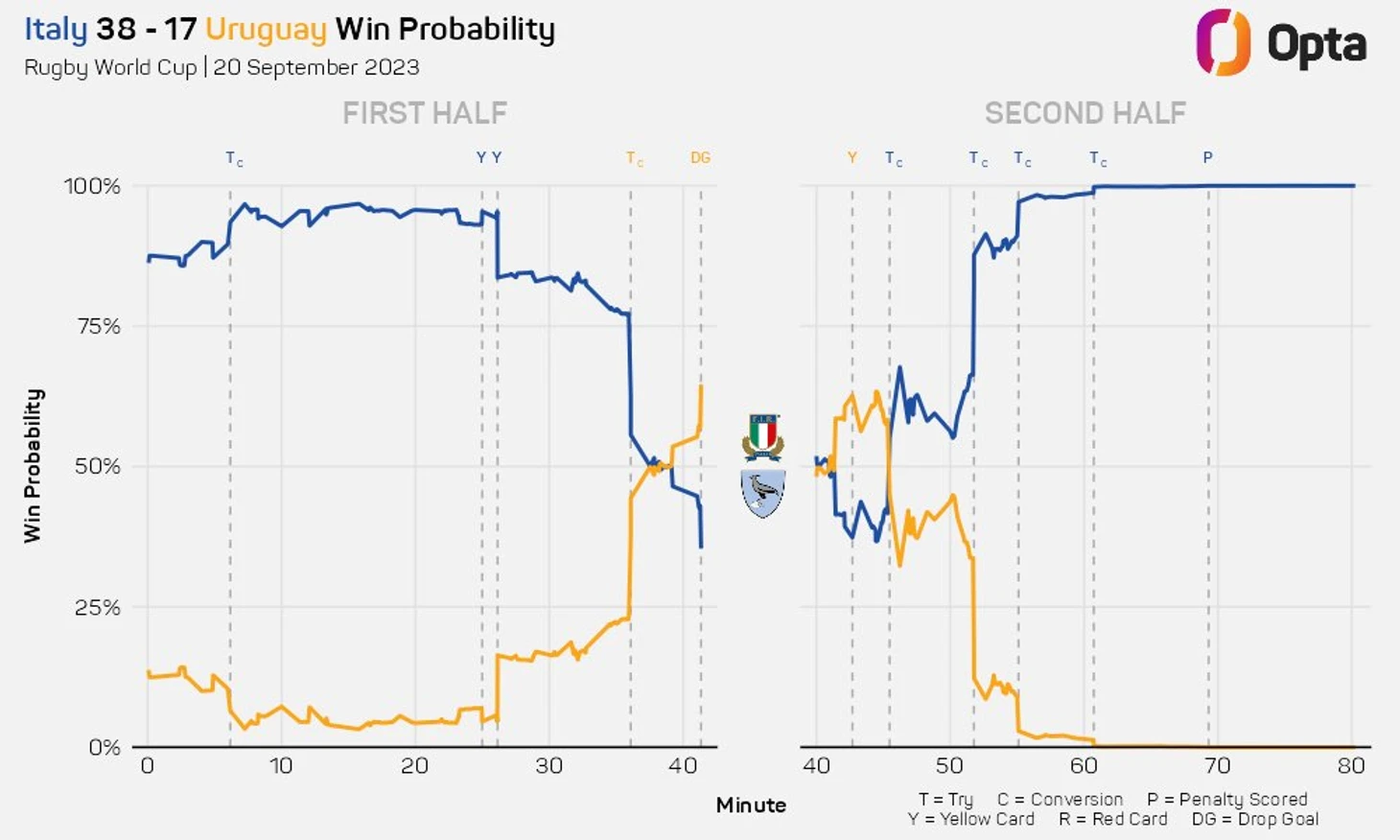 Это был всего лишь четвертый раз, когда они лидировали после первых 40 минут матча Кубка мира. В первых трёх случаях они одержали победу, но на этот раз впервые уругвайцы лидировали к перерыву, но не смогли победить, поскольку Италия организовала впечатляющий отпор.