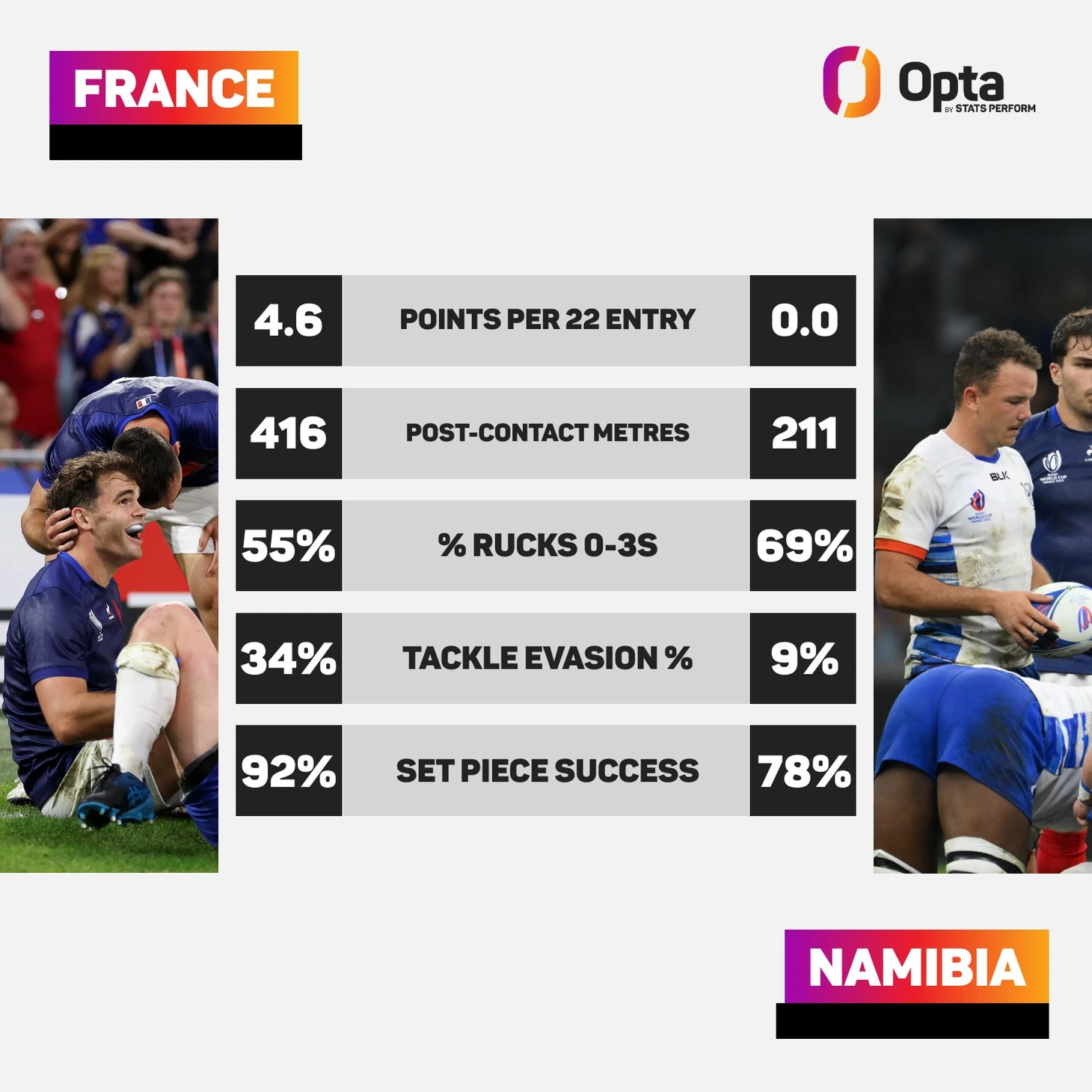 Не сумев набрать бонусное очко неделей ранее против Уругвая, сборная Франция решила не рисковать таким же исходом в матче против Намибии, и на поле для встречи с вельвичиями вышел основной состав. Это принесло свои плоды на табло, поскольку Франция зафиксировала свою самую крупную победу в тестах, но скрам-хав и талисман команды Антуан Дюпон получил травму. Франция выиграла свои последние 17 домашних игр, но за эту победу заплатили слишком высокую цену.