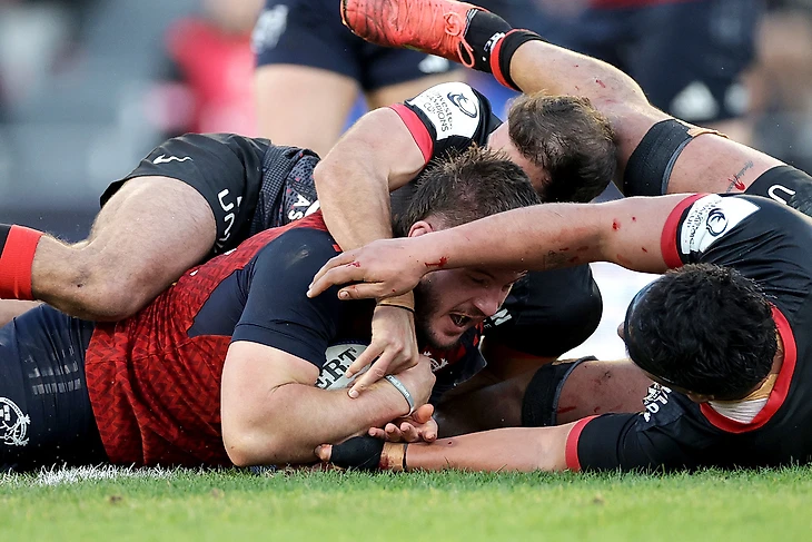 До 24-й минуты, когда давление вылилось наконец в результат. Попытку начал Джиута Вайниколо, неожиданно легко прорвавшийся через центр поля. А занос оформил Дункан Пайа’ауа. Джек Краули со штрафного отыграл 3 очка почти тут же. А ещё через 3 минуты счёт уже стал 10:10 – это ирландские форварды, стянув на себя обороняющихся, скидывают на Нанкивелла. Новозеландский центр становится одним из лидеров «Манстера». Первый тайм был богатым на события, и мы увидели ещё штрафной Жемине (точный) и попытку Самйона Зибо (отдадим должное Краули – короткая свечка от 10-го номера стала ключом к успеху). «Тулон» получил опасный коридор в концовке, но «Манстер» мяч забрал.